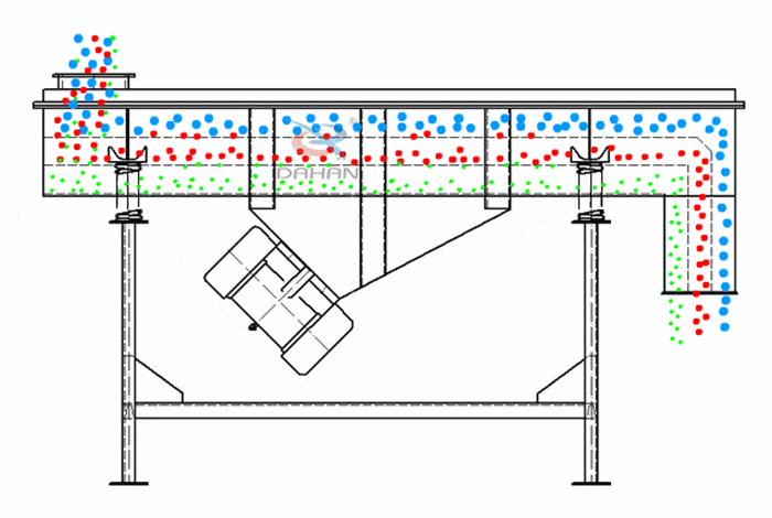 當(dāng)葵花籽經(jīng)由直線振動(dòng)篩入料口進(jìn)入直線振動(dòng)篩篩面上時(shí),直線振動(dòng)篩利用其雙臺(tái)電機(jī)的激振力及葵花籽自身的重力作用,使得葵花籽在篩面上被拋起并向前運(yùn)動(dòng),小于篩面孔徑的葵花籽落入篩面下層,大于篩面孔徑的葵花籽在跳動(dòng),不同規(guī)格的葵花籽分別從各自的出口排出,以此完成整個(gè)篩分除雜過(guò)程。