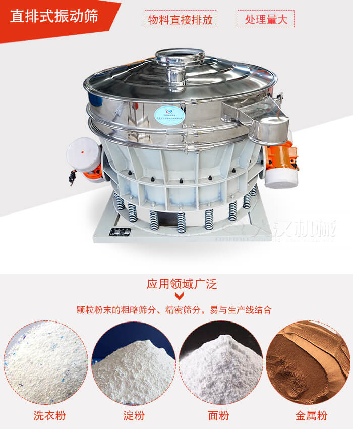 直排式振動篩振動源分單電機和雙電機結(jié)構(gòu)形式,物料運行軌跡有多種調(diào)節(jié)形式,設備適用性顯著增加;物料直接排放有更大的處理量。多用于面粉、淀粉、洗衣粉、金屬粉、添加劑、化工、非礦等行業(yè)的顆粒粉末的粗略篩分、精密篩分,處理量大、易與生產(chǎn)線結(jié)合??稍?00MM至1800MM之間選擇。
