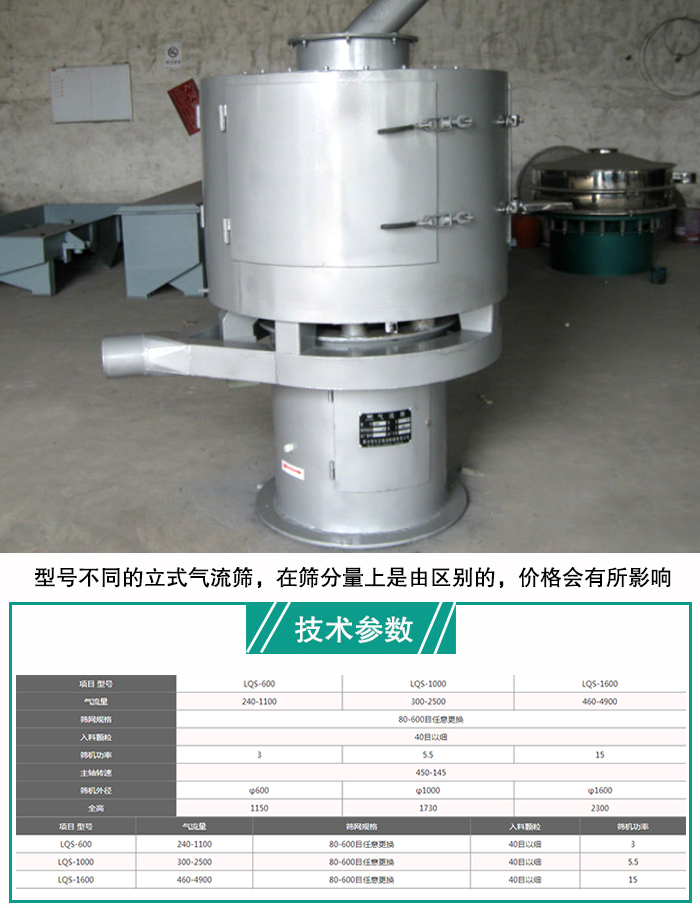 型號(hào)不同的立式氣流篩,在篩分量上是由區(qū)別的,價(jià)格會(huì)有所影響。大漢立式氣流篩型號(hào)有LQS-600型、LQS-1000型、LQS-1600型等,不同型號(hào)的立式氣流篩,其氣流量、電機(jī)功率、篩機(jī)外徑等都是不同的,所以?xún)r(jià)格自然也是不同的。